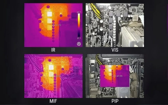The HG4 supports IR (Infrared), VL (Visible Light), MIF (Multi-Image Fusion), and PIP (Picture-in-Picture) modes, allowing users to overlay or switch between infrared and visible views for clearer temperature analysis.